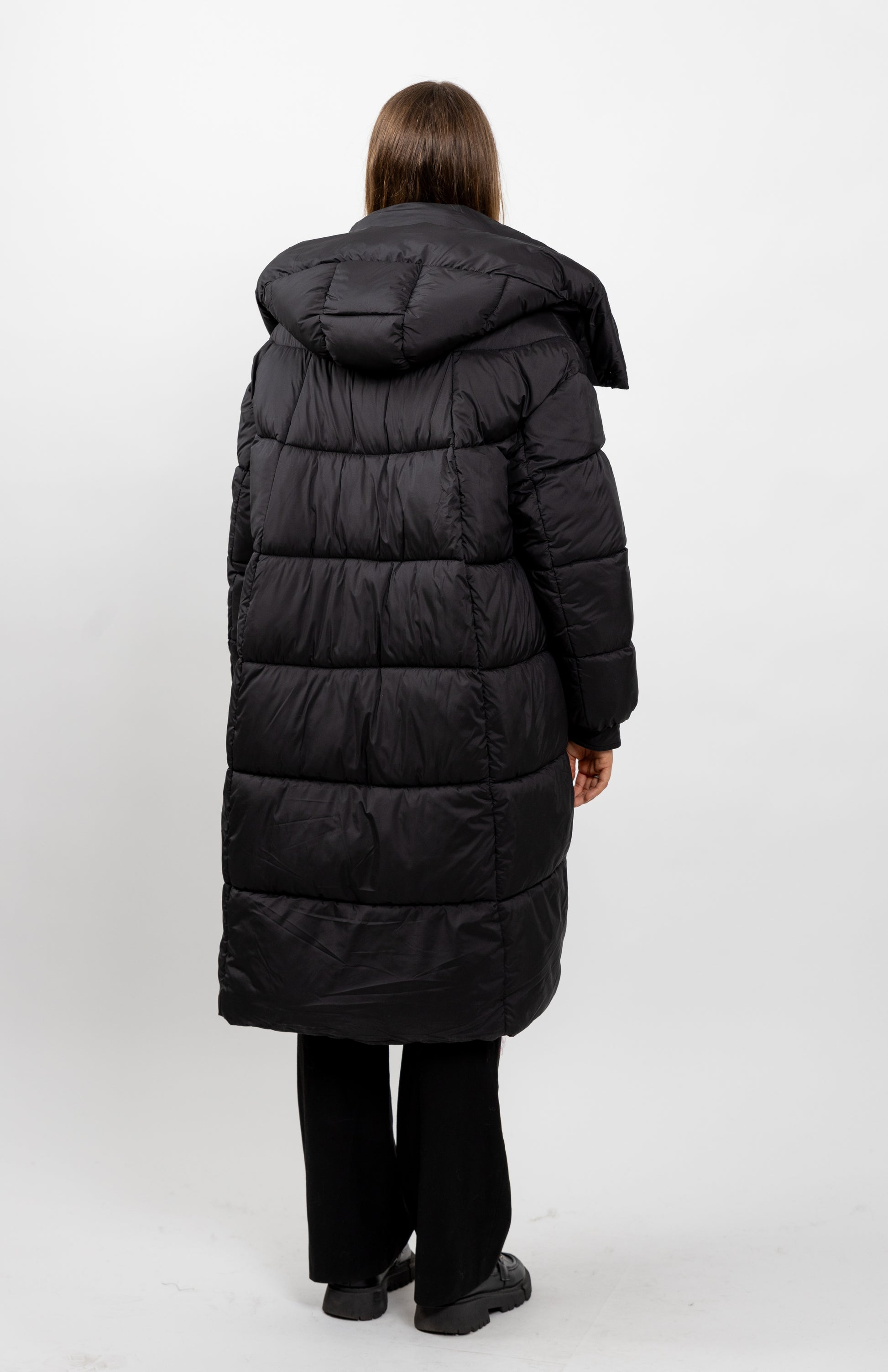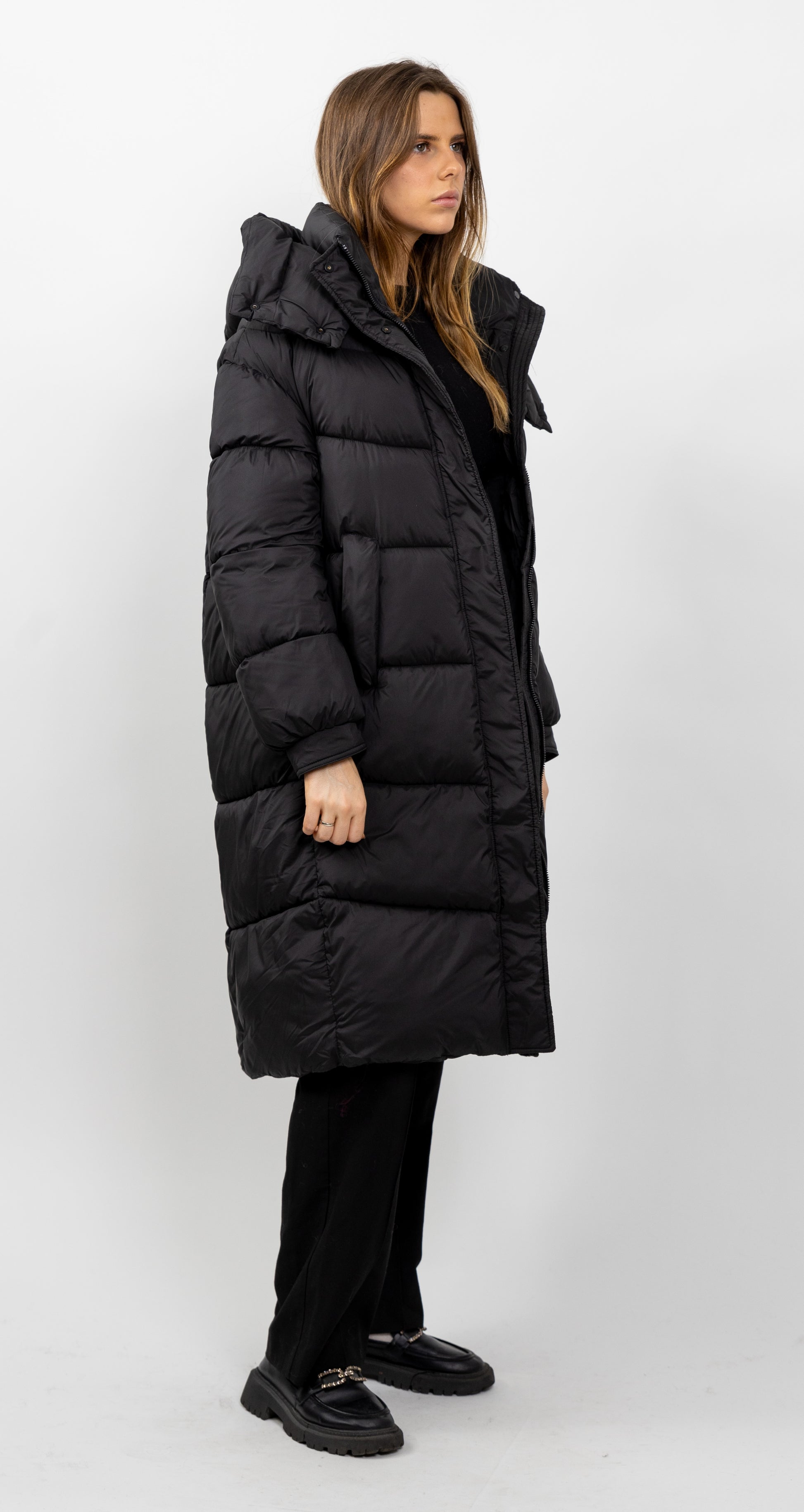 Cette doudoune longue est pensée avec un tissu résistant à l'eau qui la rend adaptée aux intempéries. Elle propose une coupe moderne et enveloppante, avec une capuche, pour un effet cocooning. Des détails aux poignets et des poches larges complètent le design, optimisant l'usage.