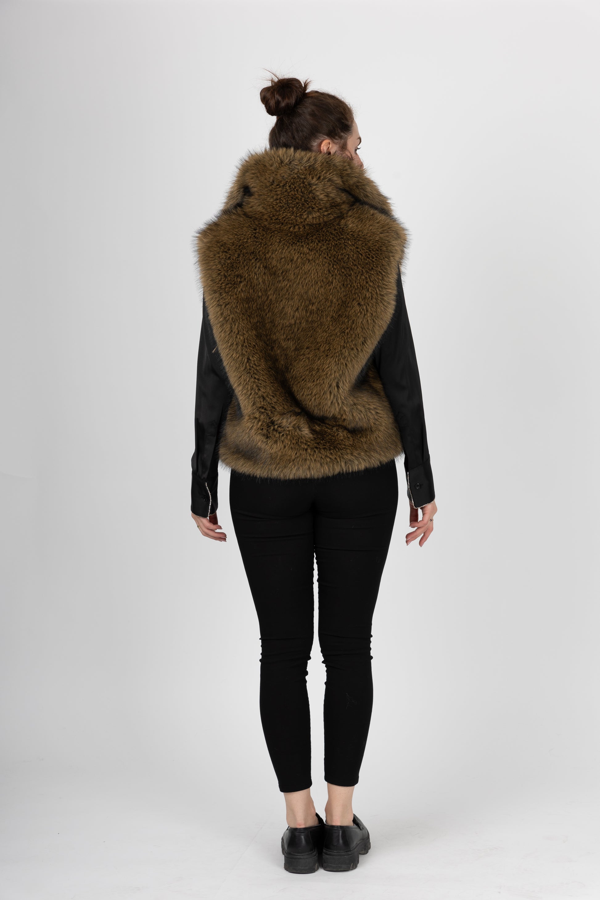 Gilet en fausse fourrure effet couleur fauve. Col montant ferme par un zip. A porter par dessus vos vetements leger ou sous un manteau.