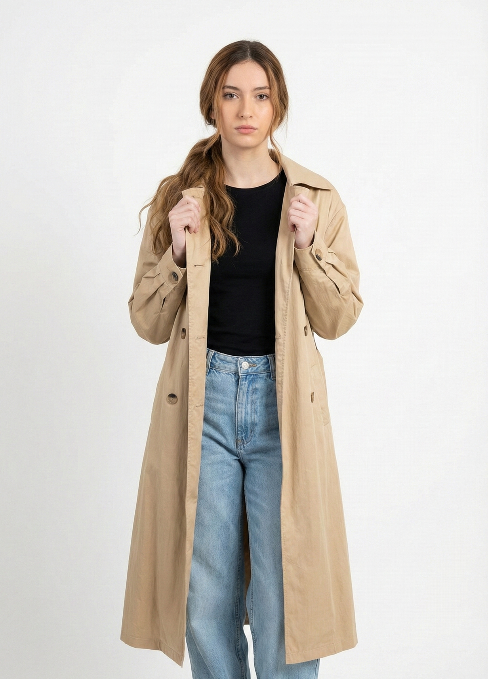 Our Fabric Trench Coat is a truly perfect fusion of classic style and contemporary trend. It offers a flattering fit with its adjustable belt, available in honey and black. Perfect for everyday elegance or a special occasion. Redefine your style with this must-have trench coat.