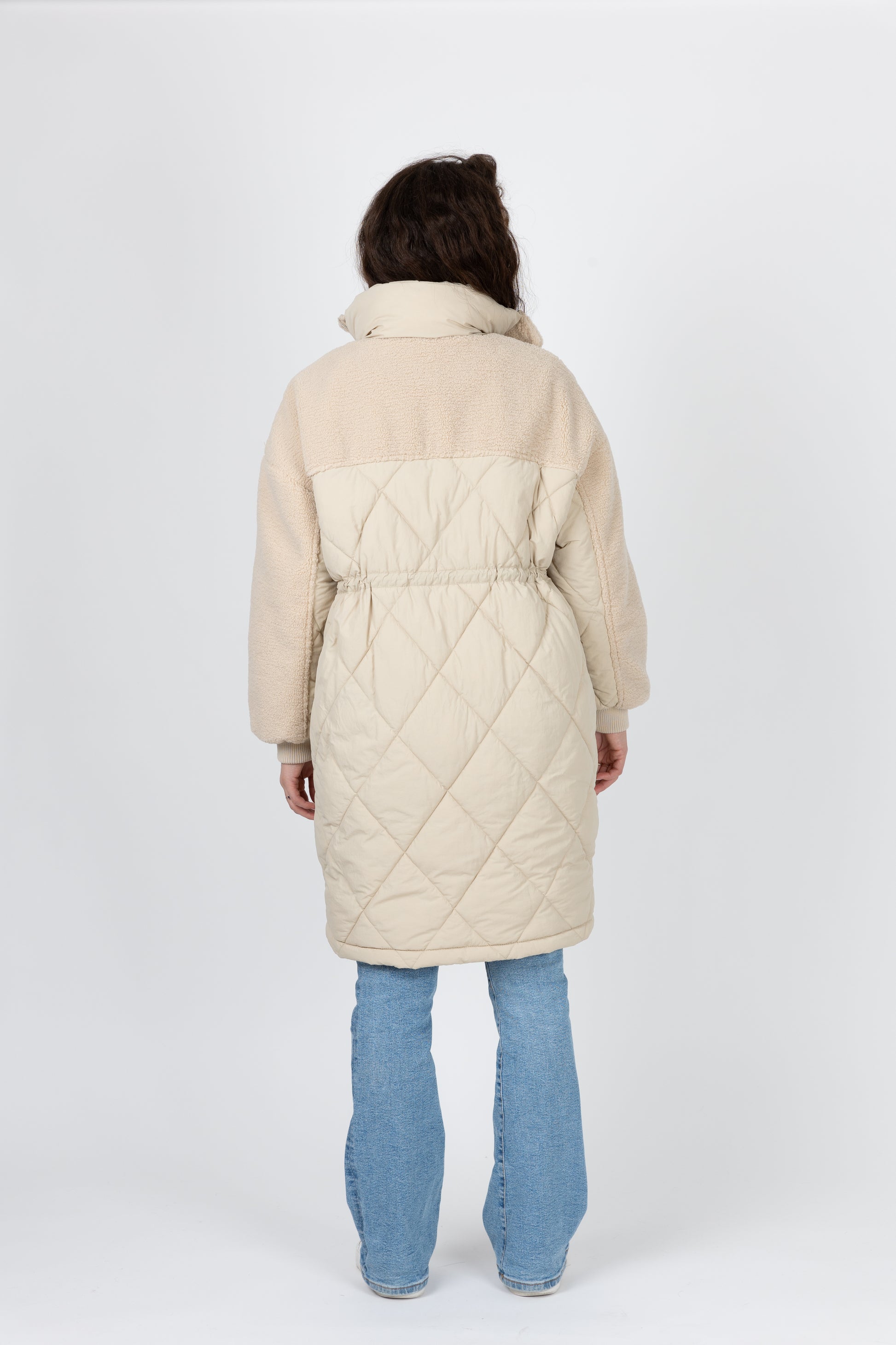 Adoptez ce manteau bi-matière pour un hiver stylé et douillet. La partie supérieure en fausse fourrure mouton s'associe à un bas effet doudoune, créant une allure contemporaine affirmée. Un lien de serrage à la taille permet de cintrer ce vêtement chaud, alliant confort et élégance.