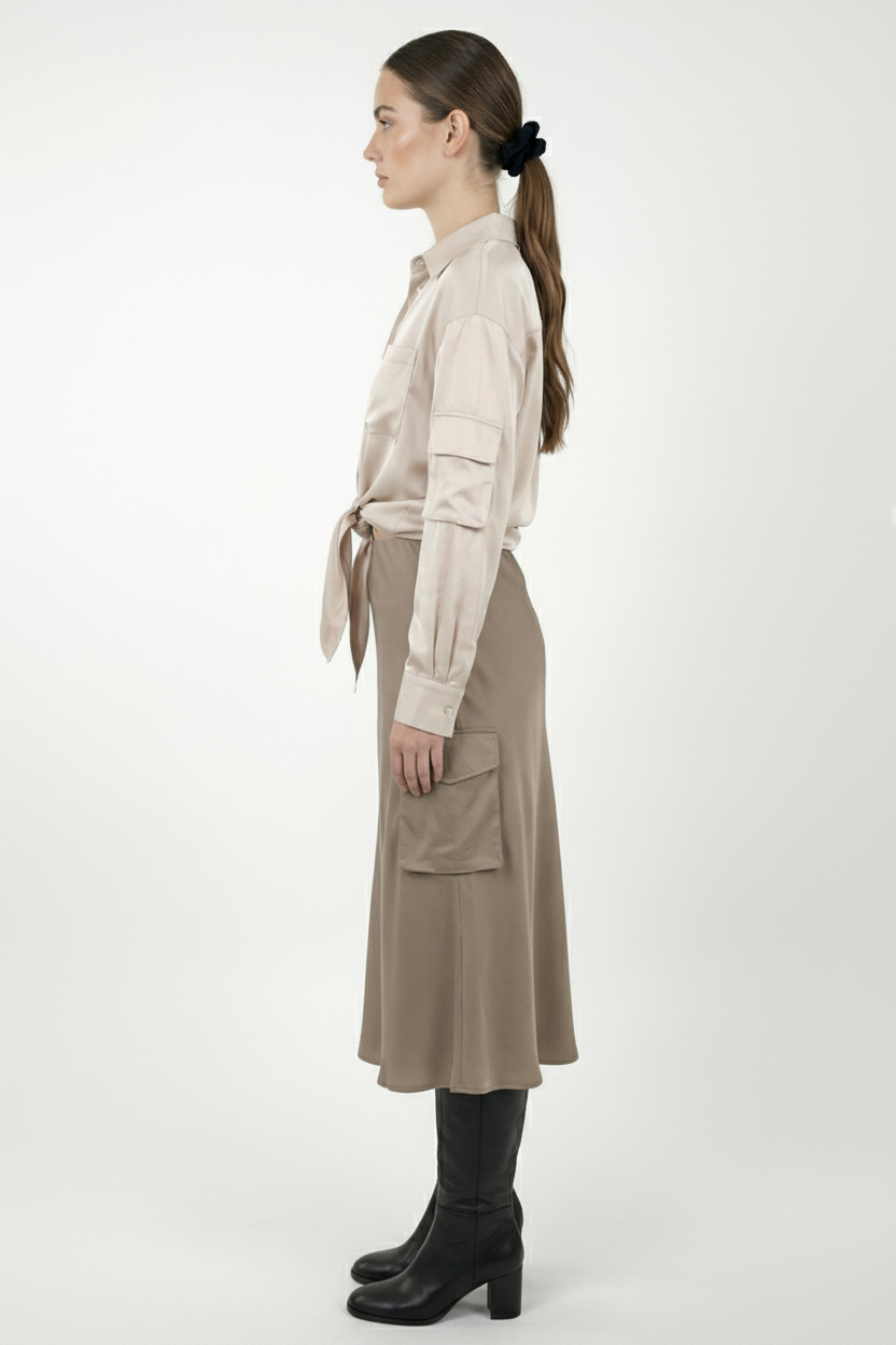 This mid-length satin skirt is a must-have for spring! Flowing and easy to pair with any outfit. The side pockets give it a practical, streetwear touch that we love!