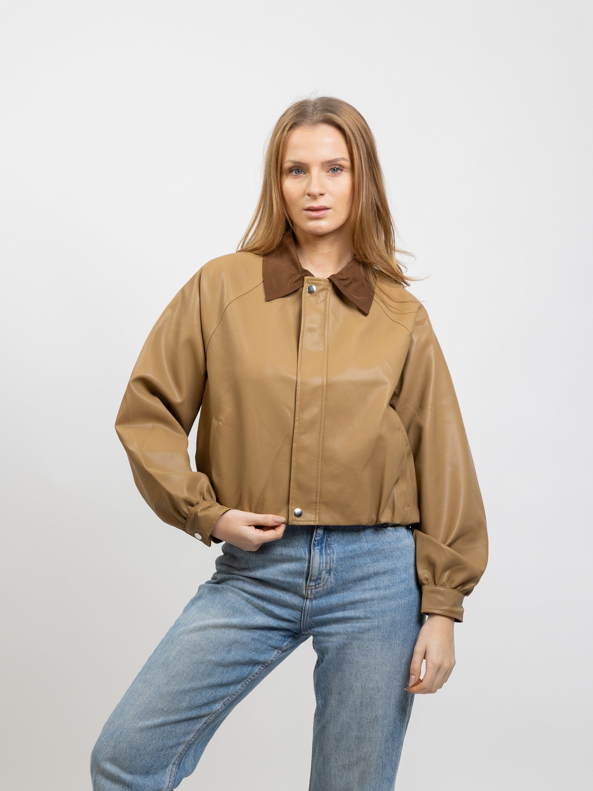 FAUX LEATHER JACKET WITH CONTRAST COLLAR