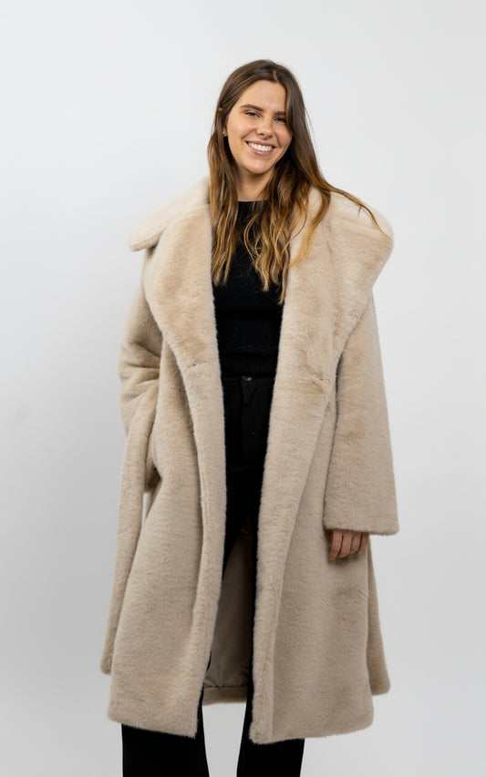 ABRIGO LARGO DE PIEL SINTÉTICA CON CINTURÓN EN LA ESPALDA