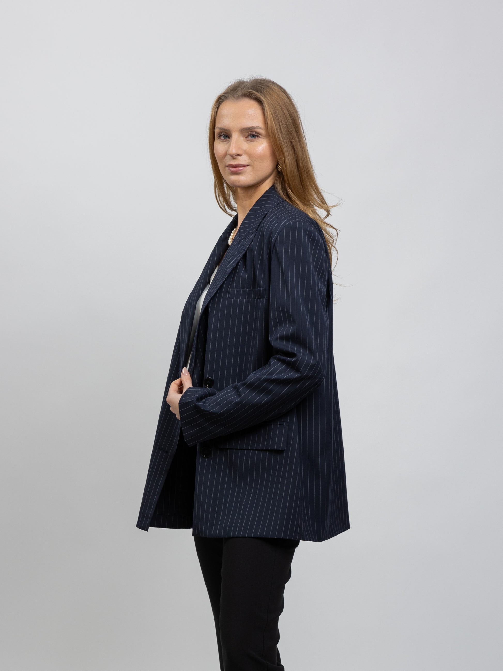 Enamórate del encanto único de nuestro blazer oversize de raya diplomática. Su estilo andrógino y audaz te permite expresar tu personalidad con confianza. ¡Llévalo con los pantalones a juego ( 3560 ) para un look completo!