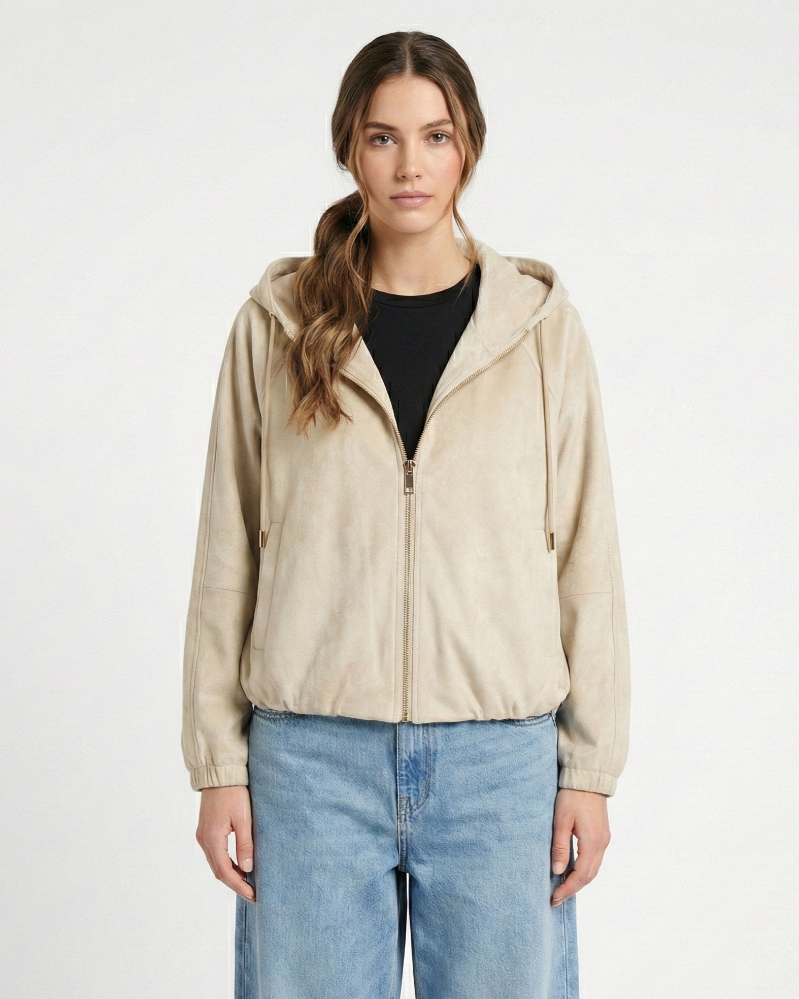 ¡Nuestra chaqueta con capucha para mujer combina estilo y comodidad! Con su suave efecto ante, esta chaqueta combina la elegancia del ante con el estilo informal de una chaqueta deportiva. Su corte y capucha la convierten en la opción ideal para un look elegante e informal.